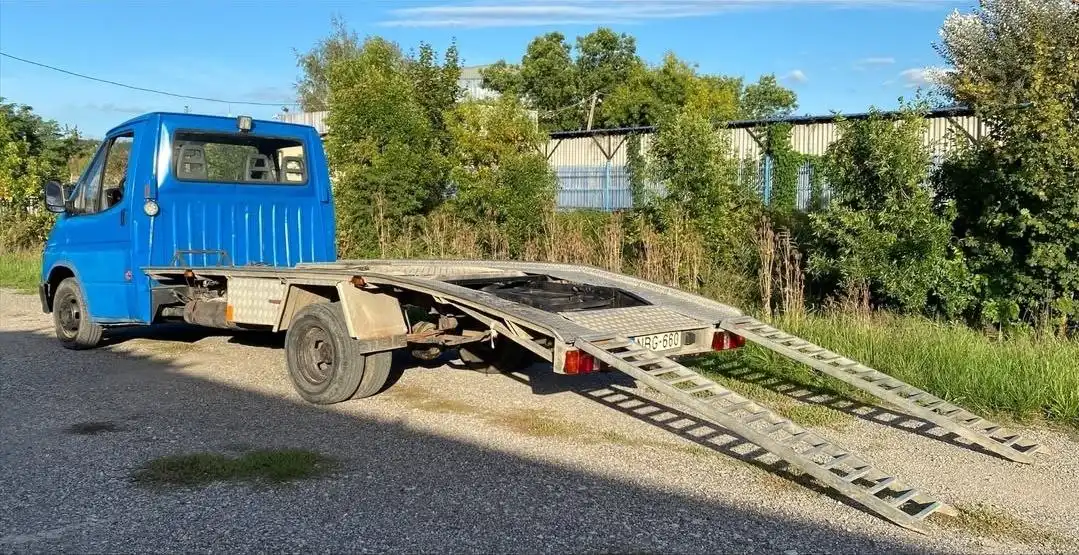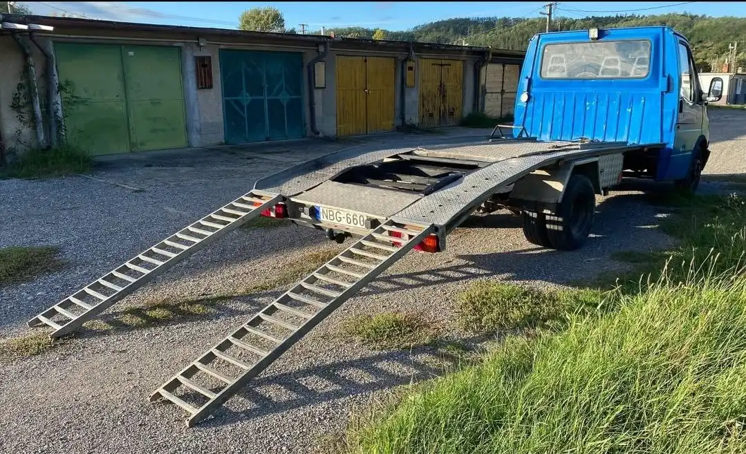 Hivatalos járműszállító, dupla kerekes, alvázba épített kézi csörlő (hivatalos, forgalmiba bejegyezve, munkavédelmi felülvizsgálattal), vonóhorog, munkalámpa.